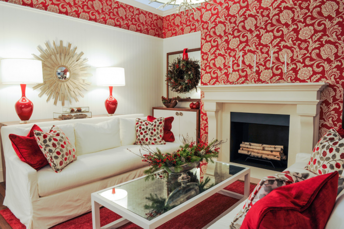 Ini merupakan salah satu desain ruang tamu dengan wallpaper dinding berwarna merah yang terlihat mewah
